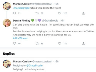Margaret Lynch, who apparently originated this comment is another Alba candidate, and one who in the blog Wings Over Scotland on 31 March referred to transgender women as, quote, “crossdressers – but not real women”. Denise Findlay later deleted her Tweet, but not before she had managed to set the heather on fire among the transphobic Twitterati.