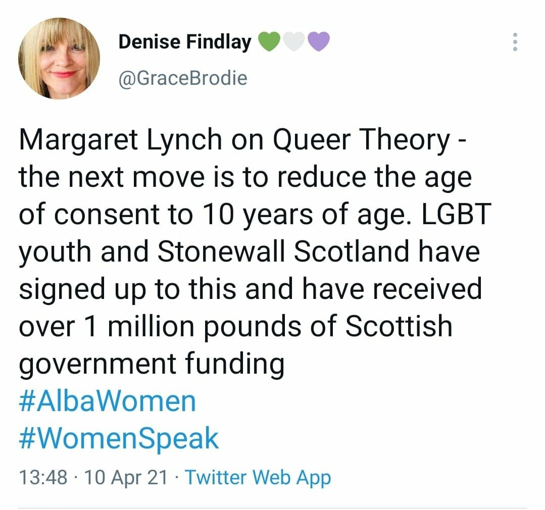 Denise Findlay, an Alba candidate, posted on Twitter, “Margaret Lynch on queer theory – the next move is to reduce the age of consent to 10 years of age. LGBT youth and Stonewall Scotland have signed up to this and have received over 1 million pounds of Scottish Government funding.”